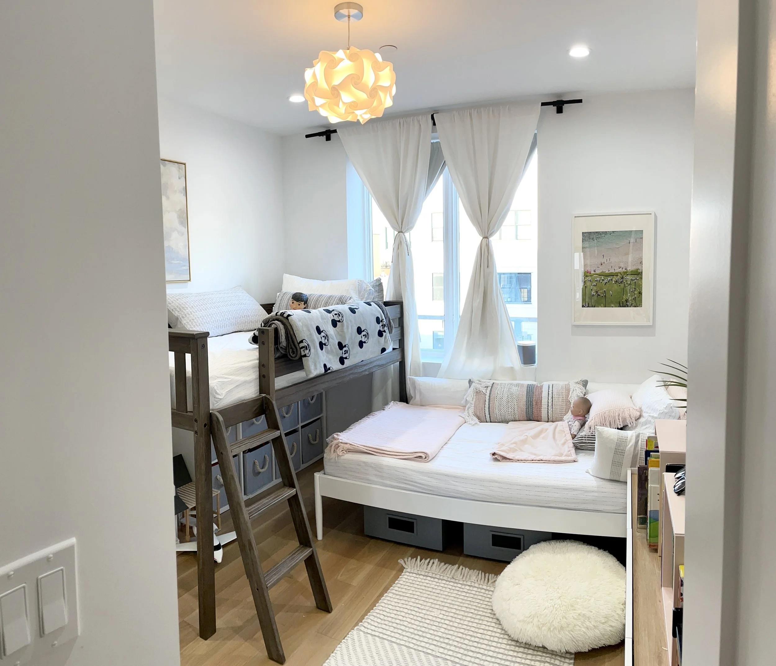 The kids’ room was approximately _ x _ feet. When we first moved in, the kids were quite young and I was worried that a traditional bunk bed would be too high for my older one. I settled on a “low loft” bed so there would be space underneath for storage and play. (In the BEFORE photo you can see I had cube storage beneath which was handy for corralling all the toys.) We did try a side by side configuration initially but the path in between the two beds was too narrow so we settled on the